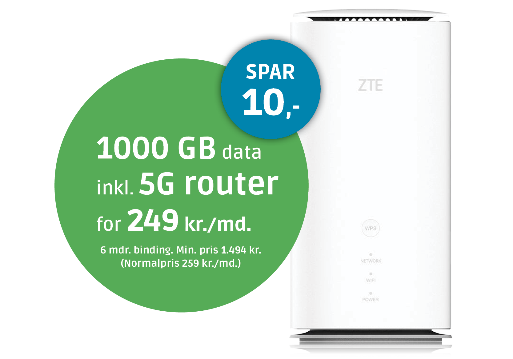 Du får 1000 GB data hver måned og en 5G lånerouter for kun 249 kr./md. inkl. 10 kr. i Ældresagen rabat. Der er gratis oprettelse.